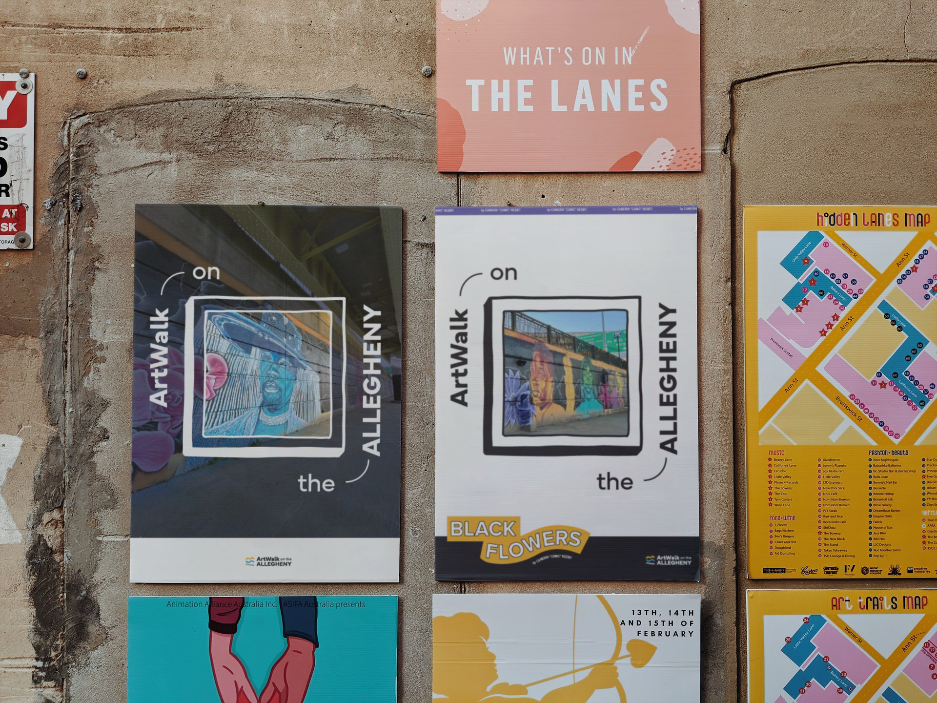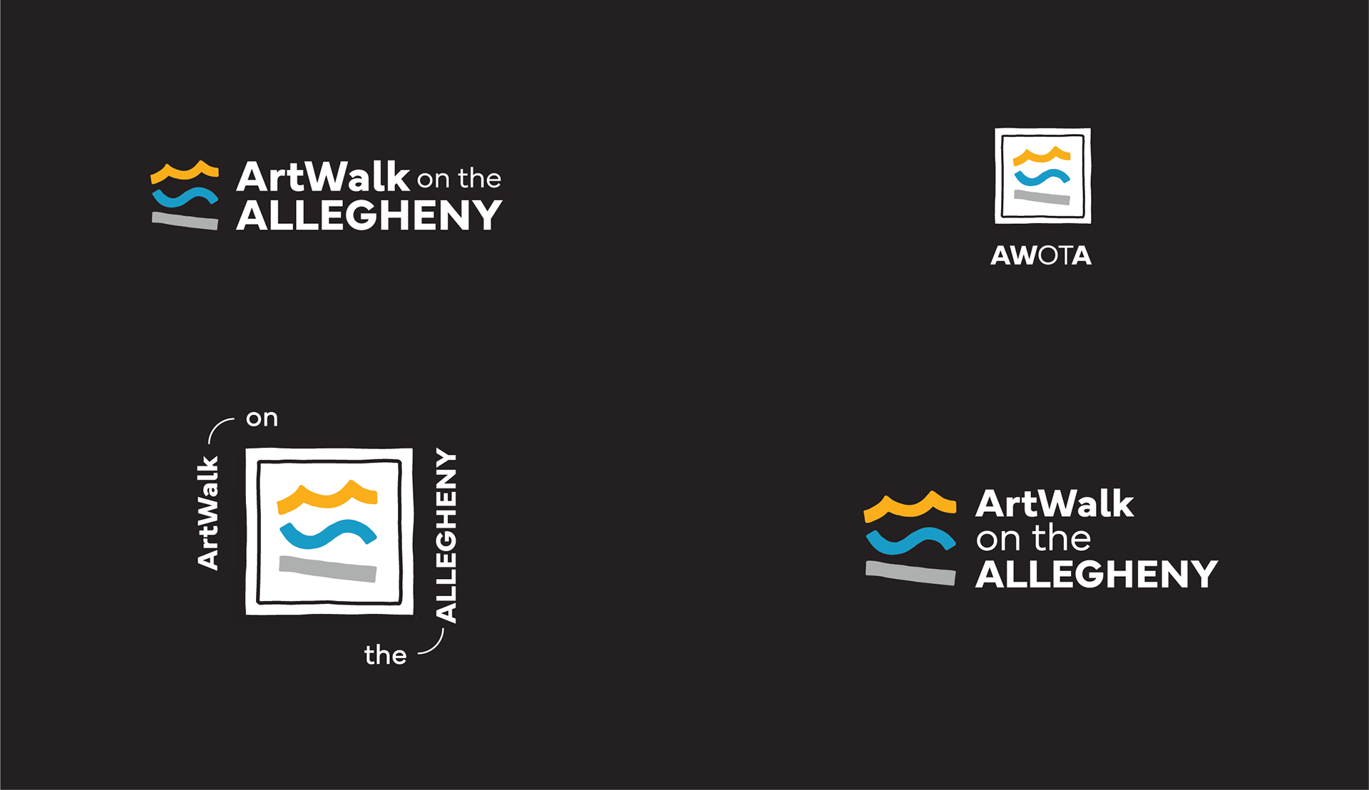 A Brkich Design Group Project. A new semi-permanent ArtWalk is being installed along the Allegheny River in downtown Pittsburgh, PA. The client wanted this visual identity to strongly reflect the location of the ArtWalk, so we started brainstorming the best was to capture a fun, 'artsy' take on the surrounding landscape. The result was a museum-inspired logo with a unique, abstract mark which represents the bridges, water, and paths along the ArtWalk. Keeping with the location-based identity, the brand pattern is made up of groupings of small shapes similar to what you might find on a map key.