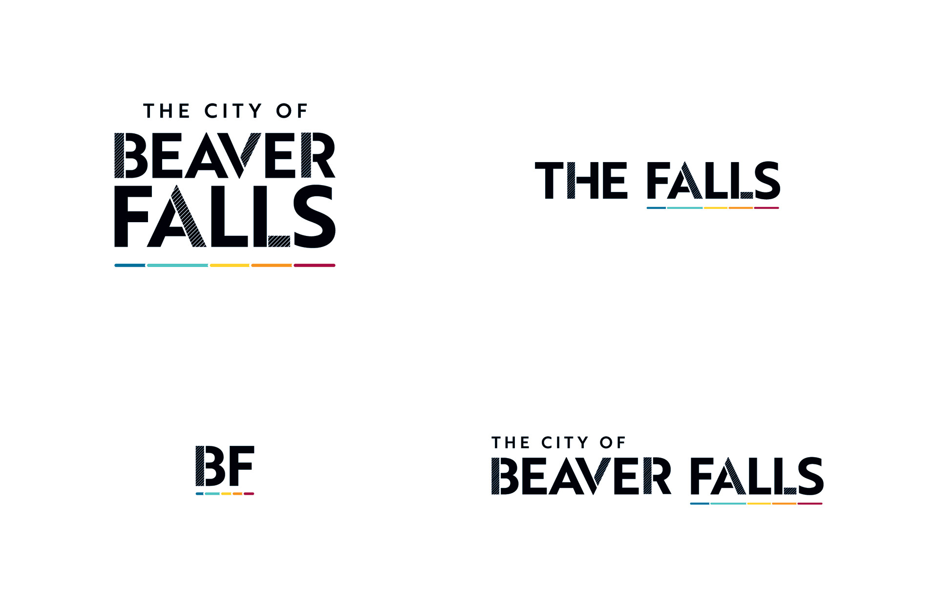 This logo needed to be very versatile and adaptable. It is used for official city/government business as well as for promoting fun city events and community gatherings. To accomplish this, Beaver Falls has a 'serious' suite of logos and a 'colorful' suite of logos (shown in the gif below).